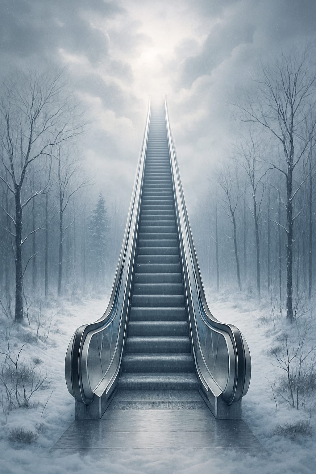 “Very good. As you walk, the trees grow fewer and fewer until you reach a small clearing. In the middle of the meadow, you see something that seems impossible at first—an escalator. As you approach it, you notice it’s made of shining silver. Strangely, you find it perfectly natural, even beautiful. You look up and see it stretching into the sky, disappearing beyond the clouds. Can you picture it?”