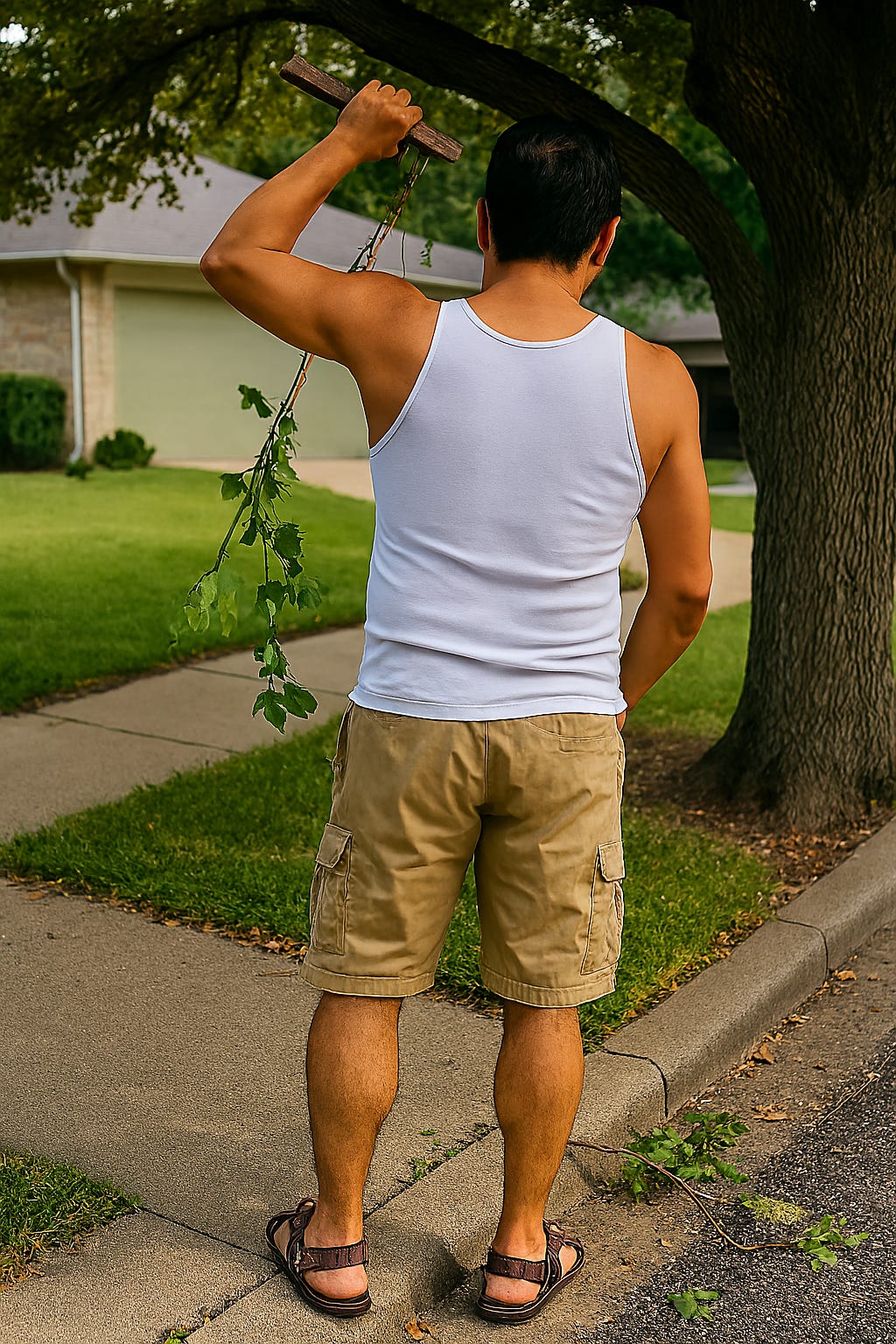 “When we got home, our father was standing off the driveway on the sidewalk, underneath a big oak tree, in the white wife beater he always wore, with shorts and sandals. When he saw us, unlike my mother, all I could see in his face was pure rage. He reached up into the tree, pulled a branch off, and began stripping away its leaves and smaller twigs.